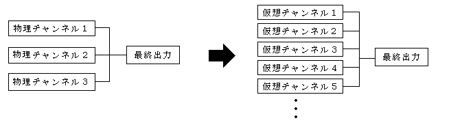 仮想インスタンスは、ソフトウェアであるとは限りません。 たとえば、3チャンネルを持った音声出力装置を VIP にした場合 (チャンネルを仮想インスタンスにして無限のチャンネルを 扱うことができるようにした場合)、 いくつかのチャンネルはデバイスに割り当てられ、 残りのチャンネルはソフトウェアのみになります。