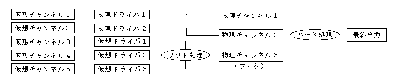 物理ドライバは、物理チャンネルに割り当てられているときに使われ、 物理チャンネルの数だけあらかじめ生成しておいて破壊はしません。 仮想ドライバは、ワークの物理チャンネルに割り当てられているときに 使われ、必要になるたびに生成と破壊をします。 上の図で、ソフト処理、ハード処理の部分は、あとで説明する 「同期」の章を参照してください。 ワーク以外の物理チャンネルにつながっている(データ領域)は、 まれに省略されることがあります(ライトバック同期のとき)。 物理チャンネルは、別のデバイスになっていることもあります。
